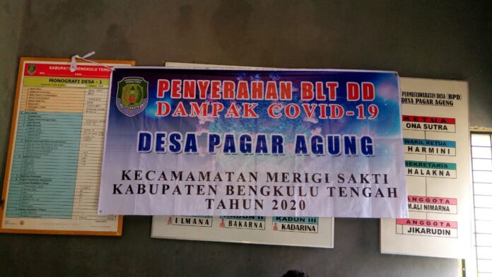 Bengkulu Tengah – Pemerintahan Desa Pagar Agung Kecamatan Marigi Sakti Kabupaten Bengkuu Tengah, hari ini senen, (29/06/2020) Melaksanakan Pembagikan Bantuan Langsung Tunai (BLT DD) dan tahap Dua kepada Keluarga yang terkena dampak Covid-19. Di bagikan langsung oleh pemerintah Desa yang di hadiri oleh Polsek Pagar Jati, Babinsa, BPD, Pendamping Desa, Pegawai Bank BPD Taba Penanjung serta masyarakat penerima bantuan.